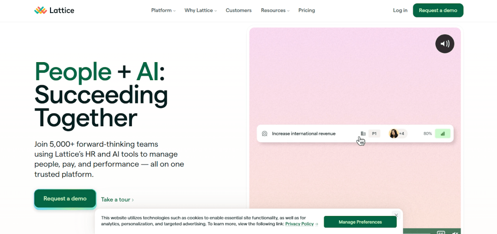 Lattice is a people success platform that uses AI to support performance management, employee engagement, and HR operations. Its AI features are tightly integrated into engagement surveys, feedback, and help desk workflows.