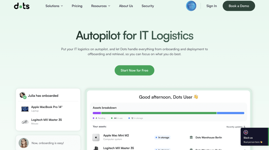 Dots is an IT asset management platform built for distributed teams, with a free-forever plan that allows device tracking via MDM/HRIS integrations or manual uploads.