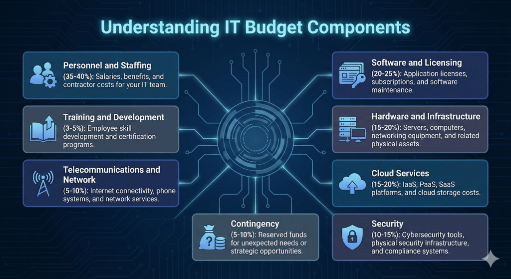 Understanding where your IT dollars go is the first step toward controlling them. Most organizations split their budgets across eight core categories, but the distribution is shifting as new technologies reshape priorities.