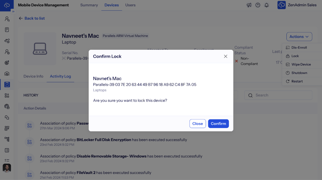 ZenAdmin centralizes all compliance-related activities through a unified dashboard that stores details of licenses, warranties, and regulatory certifications for every device and software instance. Everything action has a complete audit trail for it.